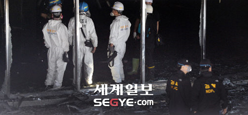 | 26일 오전 9시쯤 경기 고양시 일산동구 백석동 고양종합터미널 내 지하 1층 화재 현장에서 검찰과 소방방재청 관계자 등이 현장감식을 하고 있다. 고양=김범준 기자 |