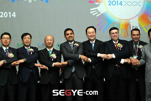 | `2014 바이오코리아`가 일산 킨텍스에서 개최된 가운데 문형표 보건복지부 장관(사진 왼쪽 세번째)를 비롯한 관계자들이 서로 손을 맞잡고 있다. |