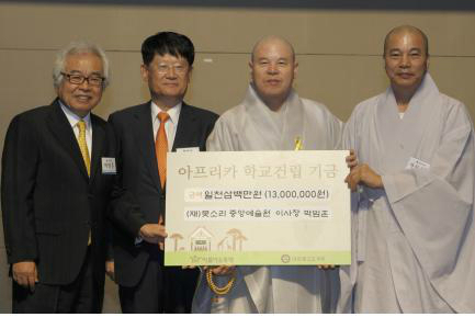 | 박범훈 이사장이 아프리카 학교 건립기금으로 1300만원을 아름다운동행에 기탁했다. (왼쪽부터) 박이사장, 김동건 불교포럼 대표, 자승 스님. 자공 스님(아름다운동행 사무총장). |