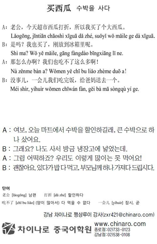 [生生 중국어 한마디] 수박을 사다 입력 : 2014-06-03 21:28:56 수정 : 2014-06-03 21:28:56 구글 네이버 유튜브 Copyright ⓒ 세계일보. 무단 전재 및 재배포 금지 세계일보