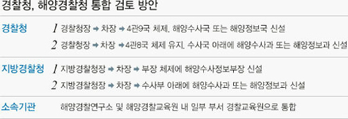 경찰청이 해경 조직을 통합하기 위해 검토해야 할 일은 한두 가지가 아니다. 해양 수사의 전문성을 고려해 해양수사국을 신설하거나 경찰청을 1, 2차장 체제로 개편하는 방안을 검토하고 있다. 이렇게 하려면 지방청 직제를 개편해야 하고, 해경의 4개 지방청과 1개 직할서, 15개 경찰서의 정보·수사 분야 활용 방안도 마련해야 한다. 해경의 정보수사국 내에 있는 범죄감식 등 과학수사·광역수사 업무를 경찰과 통합하는 방안도 연구해야 한다. 정보 분야에서는 해경의 보안경찰 업무를 흡수하는 게 불가피하다.