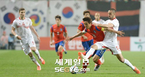 | 브라질 월드컵에서 사상 첫 원정 8강 진출에 도전하는 축구대표팀의 주장 구자철(오른쪽 두번째)이 28일 서울월드컵 경기장에서 열린 튀니지와의 평가전에서 상대 수비수의 거친 몸싸움을 뚫고 문전 돌파를 노리고 있다. 김범준 기자 |