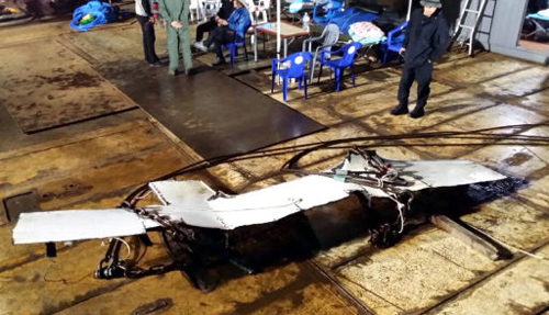 | 6일 오후 전남 진도군 동거차도 부근 세월호 침몰 현장에서 4층 선미 우현 다인실 쪽 창틀이 절단작업 뒤 인양돼 바지선 갑판에 놓여 있다. 진도=연합뉴스 |
