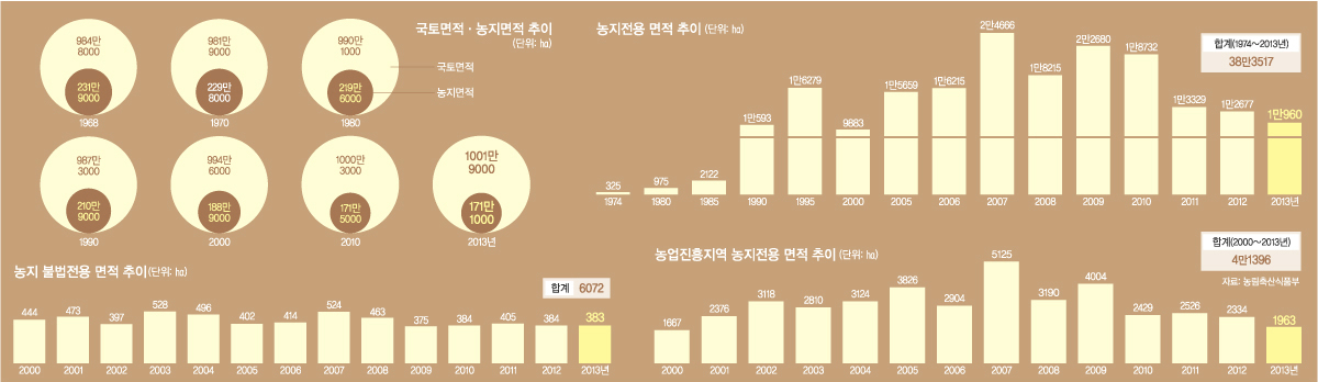 농림축산식품부에 따르면 농지전용 면적은 1984년까지 연간 2000ha 미만이었다. 이후 급속한 산업화와 도시화 등으로 농지전용 면적은 1990년 1만ha를 넘어섰다. 혁신도시와 행정중심복합도시, 4대강사업 등의 영향으로 2007년에는 2만4666ha로 정점을 찍은 데 이어 2008년 1만8215ha, 2009년 2만2680ha, 2010년 1만8732ha 등 대규모로 전용됐다. 이렇게 지난 40년간 전용된 농지는 서울시 면적의 6.3배(38만3517ha)에 해당한다. 지난해는 1만960ha로 농지전용 규모가 축소했지만 올해는 규제개혁 완화와 일자리 창출 등으로 더 늘 것으로 보인다. 한국농촌경제연구원은 앞으로도 연간 1만ha 정도의 농지가 전용될 것으로 전망하고 있다. 그러나 정부의 ‘간척농지조성계획’에는 2022년까지 간척으로 조성할 농지 규모는 1만7000ha에 불과하다. 농경연은 “농지전용이 이런 추세로 진행하면 농지 감소에 따른 식량안보 문제에 봉착할 수 있다”고 경고했다.