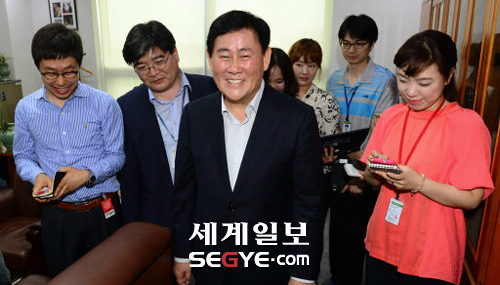 | 최경환 경제부총리 겸 기획재정부 장관 후보자가 13일 개각 명단 발표 직후 국회 의원회관에서 취재진에게 소감을 밝힌 뒤 활짝 웃고 있다. 남정탁 기자 |