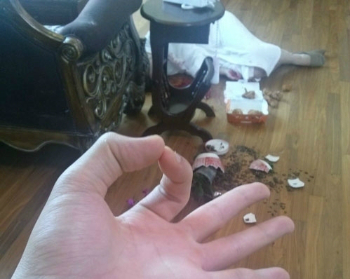 사진 게시자는 "아침까지 술 먹고 자고 일어나서 눈 뜨니까 사람이 죽어 있다. 신고는 했다. 아 내가 일베 가려고 주작(조작·없는 사실을 꾸며 만듦)했다"라는 글이 적혀 있어 충격을 주고 있다.