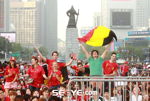 [포토] 선취 골 얀 베르통언, '환호하는 벨기에 응원단들' 입력 : 2014-06-27 06:45:10 수정 : 2014-06-27 11:09:27 구글 네이버 유튜브 벨기에 응원단들이 27일 새벽 서울 종로구 세종로 광화문광장에서 열린 '2014 브라질 월드컵' 대한민국과 벨기에 H조 조별리그 3차전 경기에서 얀 베르통언 선취 골 성공 후 환호하고 있다. 김경호 기자 stillcut@segye.com Copyright ⓒ 세계일보. 무단 전재 및 재배포 금지 세계닷컴 김경호