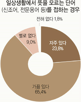 세계일보가 오픈서베이를 통해 전국 성인 1000명을 대상으로 지난 4월 스마트폰 설문조사를 실시한 결과 전 국민의 23.8%가 일상생활에서 뜻 모르는 단어를 접하는 경우가 ‘자주 있다’고 응답했다. ‘가끔 있다’는 응답자 65.4%를 합치면 국민의 89.2%가 일상생활에서 낱말 뜻을 몰라 곤란을 겪고 있는 셈이다. 뜻 모르는 단어가 ‘별로 없다’는 응답은 9.0%, ‘전혀 없다’는 응답은 1.8%였다.