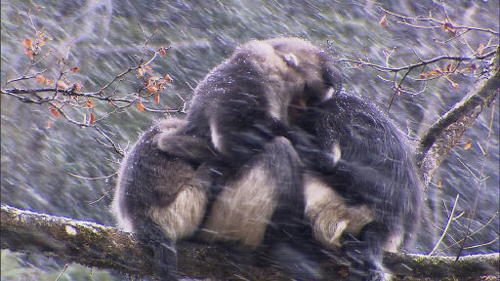 | 황금원숭이들이 겨울 추위를 이기기 위해 서로 부둥켜안고 있다. KBS 제공 |
