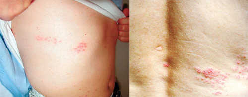 | 대상포진의 증상. 옆구리(왼쪽 사진)와 등아래(오른쪽 사진) 등 우리 몸 곳곳에 띠 모양의 포진이 생겨나고 극심한 통증을 유발한다. 세계일보 자료사진 |