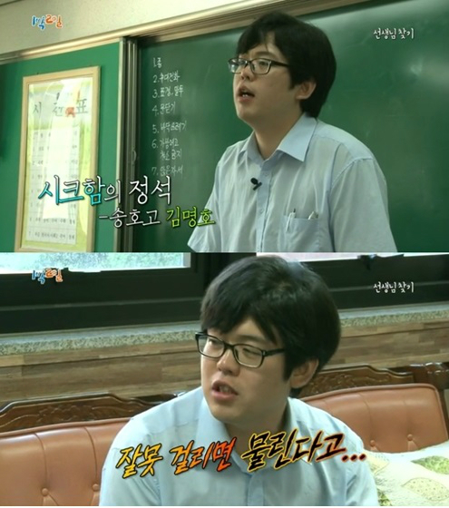 '1박2일' 국사선생님 김명호 씨는 순하게 생긴 외모와는 달리 학교에서 호랑이 선생님으로 유명했으며 학생들은 김명호 씨에 대해 "한 번 물면 놓지 않는다"고 말했다.