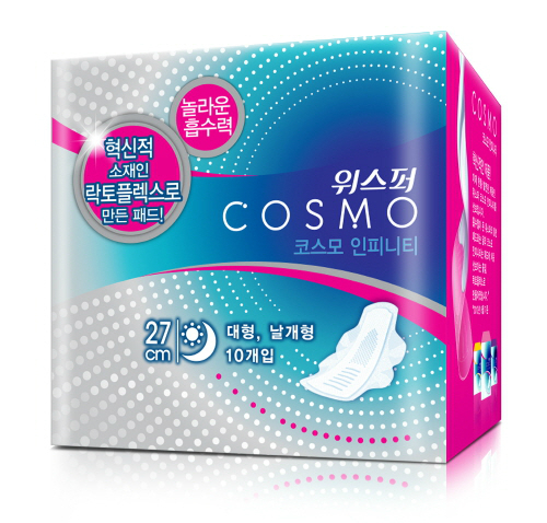 위스퍼 코스모 인피니티는 생리대에서 처음 선보이는 몸의 곡선에 맞도록 도와주는 새로운 물질인 락토플렉스로 소재로 만들어져, 부드러운 착용감을 선사한다.