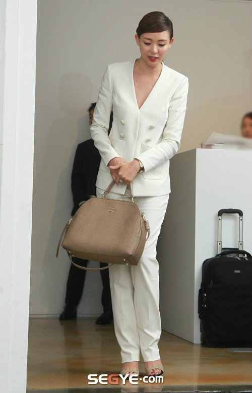 이날 그는 올 화이트 팬츠 정장을 입고 단정한 포니테일 헤어스타일에 빨간색 립스틱으로 포인트를 주는 패션 센스를 발휘, 한국 취재진의 스포트라이트를 한 몸에 받았다.