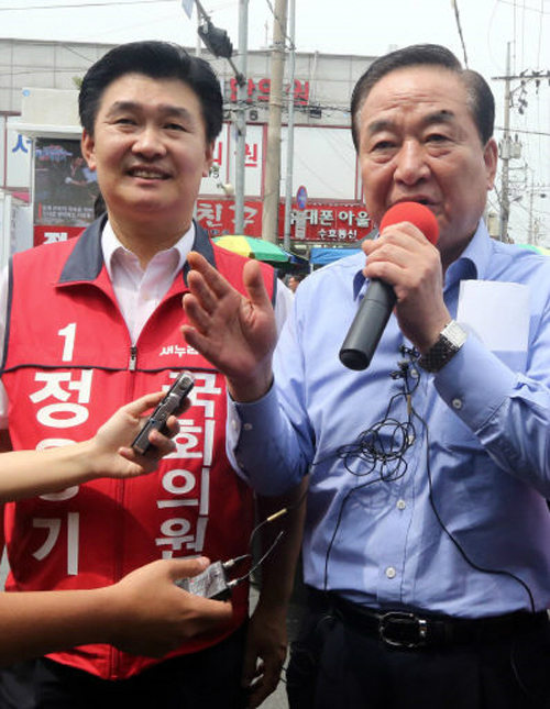 | 새누리당 서청원 최고위원(오른쪽)이 28일 대전 대덕구 신탄진시장에서 거리 유세를 하면서 시민에게 7·30 재보선에 출마한 정용기 후보의 지지를 호소하고 있다. 대전=연합뉴스 |