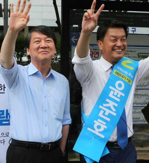 | 새정치민주연합 안철수 공동대표(왼쪽)가 28일 부산 해운대구 벡스코 앞 버스정류장에서 7·30 재보선에 출마한 윤준호 후보와 함께 손을 흔들며 지지를 호소하고 있다. 부산=연합뉴스 |