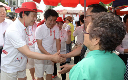 | 새누리당 김무성 대표(왼쪽)가 28일 당 상징색인 빨간색 모자를 쓰고 경기 평택시 안정리 5일장을 찾아 시민에게 7·30 재보선에 출마한 유의동 후보의 지지를 호소하고 있다. 평택=남제현 기자 |