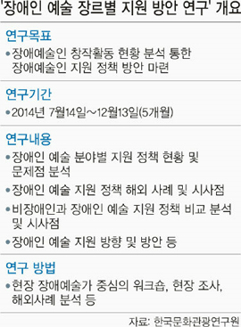 한국문화관광연구원(원장 박광무)은 최근 2014년 하반기 연구 과제를 선정하며 ‘장애인 예술 장르별 지원 방안 연구’를 포함시켰다고 4일 밝혔다. 문광연은 문화체육관광부 산하 국책연구기관이다.
