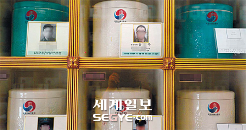 | 이제는 편안하길… 선임병들의 집단 구타 끝에 사망한 육군 28사단 윤모 일병의 위패(위쪽 가운데)가 7일 국립서울현충원 충원당에 안치돼 있다. 이재문 기자 |