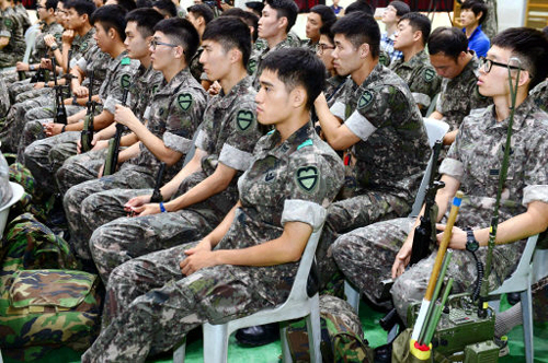 | 8일 오전 경기 고양의 육군 제30기계화보병사단 기갑수색대대 전 장병이 총을 옆에 세워둔 채 부대 강당에 모여 특별인권교육을 받고 있다. 사진공동취재단 |
