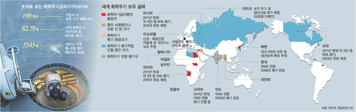 1997년 CWC 이행을 감시하기 위해 출범한 OPCW는 그간 세계 평화에 이바지한 공로를 인정받아 지난해 노벨평화상을 수상했다. 아흐메트 위쥠쥐 OPCW 사무총장은 노벨상 시상식에서 화학무기를 “볼 수도, 냄새를 맡을 수도, 사전에 감지할 수도 없는 매우 사악한 유산”이라면서 반드시 폐기돼야 한다고 강조했다. 그러나 인류가 화학무기 공포에서 벗어나기까지 아직 갈 길이 멀다.