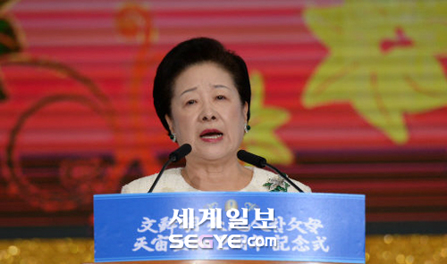 | 한학자 총재가 12일 경기도 가평군 청심평화월드센터에서 열린 ‘문선명 천지인참부모 천주성화 2주년 기념식’에서 연설을 통해 문 총재의 유업을 계승·발전시킬 것을 강조하고 있다. 가평=이제원 기자 |
