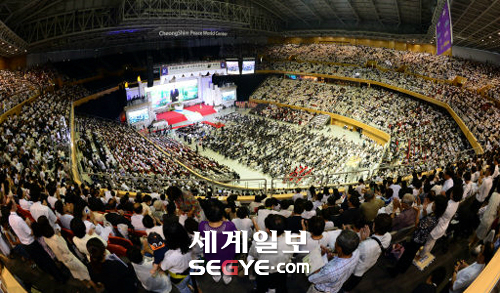 | 12일 경기도 가평군 청심평화월드센터에서 거행된 ‘문선명 천지인참부모 천주성화 2주년 기념식’에 세계 각계 지도자와 주요 인사, 신도 등 3만여명이 운집해 문 총재 내외의 업적과 숭고한 가치를 기리고 있다. 가평=남정탁 기자 |