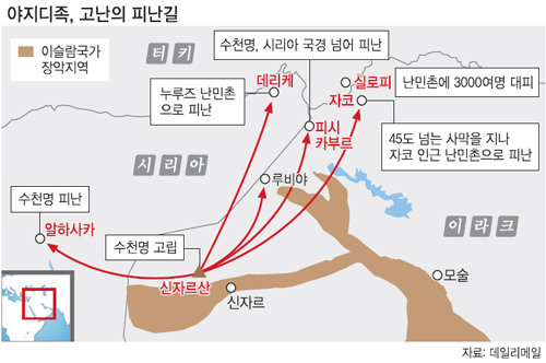 미국의 공습으로 포위망이 뚫리면서 신자르산에서 도망칠 수는 있었지만 야지디족의 삶은 이미 극도로 피폐해졌다. 13만명 이상이 반군을 피해 이라크 내 안전한 쿠르드족 장악 지역이나 시리아, 터키 등의 난민촌을 향해 뿔뿔이 흩어졌다. 일부는 섭씨 45도가 넘는 사막을 가로질러 200㎞를 걸어 피난하기도 했다. 험난한 피난길에 숨지는 이도 적지 않다고 외신은 전했다. 난민촌에서도 이들은 물과 쉼터가 부족해 탈수, 일사병 등에 시달리기 일쑤다.