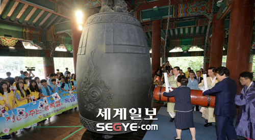 | 69주년 기념 타종 박원순(맨 왼쪽) 서울시장이 15일 서울 종로구 보신각에서 열린 제69주년 광복절 기념 타종행사에서 서울시의회 의장 등과 함께 타종하고 있다. 김범준 기자 |