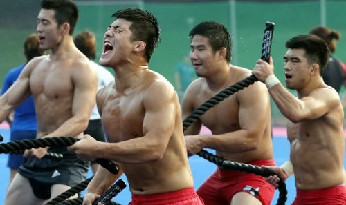 | 구슬땀 김현우(왼쪽 두 번째) 등 레슬링 국가대표 선수들이 아시안게임 개막 30일을 앞두고 서울 노원구 태릉선수촌에서 밧줄을 당기는 훈련을 하며 구슬땀을 흘리고 있다. 연합뉴스 |