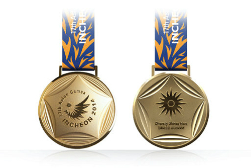 | 2014 인천 아시안게임 때 수여될 금메달의 앞·뒤 모습이 19일 공개됐다. 인천을 대표하는 하늘·바다·정보·레저·비즈니스 등 5개 요소를 연결해 원형 메달 안에 5각형 문양을 형상화한 것이 특징이다. 인천 아시아 경기대회조직위원회 제공 |