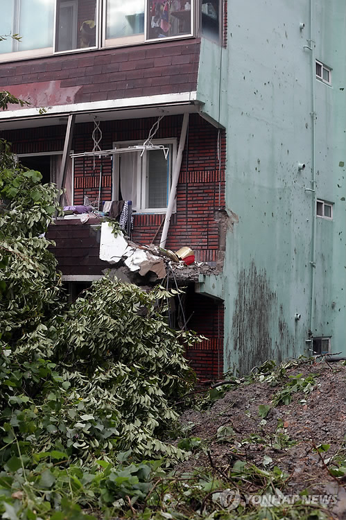 | 25일 오후 2시 22분께 부산시 북구 구포동의 한 아파트 경로당이 인근 산에서 쏟아져 내린 흙더미로 붕괴된 가운데 인근 빌라도 일부 부서져 있다. |