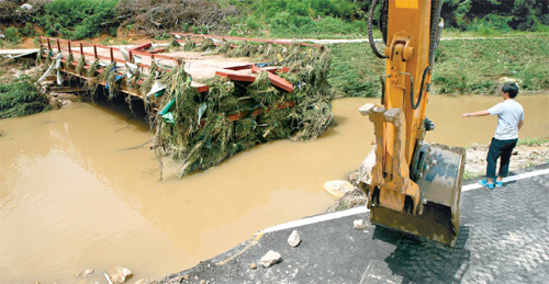 | ‘물 폭탄’에 끊긴 다리 울산시 울주군 서생면 명산리의 한 도로가 지난 25일 내린 폭우로 유실된 가운데 26일부터 포클레인 등 중장비가 들어오면서 복구작업 채비를 하고 있다. 울산=연합뉴스 |