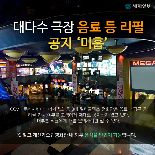 하지만 영화관은 음료나 팝콘 등 리필 가능 여부를 고객에게 제대로 공지하지 않고 있다. 대부분 직원에게 개별적으로 문의해야만 알 수 있다.