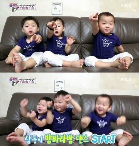 이날 이들 형제는 똑같은 색상의 옷을 입고 소파에 나란히 앉아 애니메이션 '뽀로로' 배경음악에 맞춰 춤을 췄다. 세 쌍둥이는 척척 맞는 호흡과 카메라를 향한 애교 넘치는 눈웃음으로 시청자들의 미소를 유발했다.