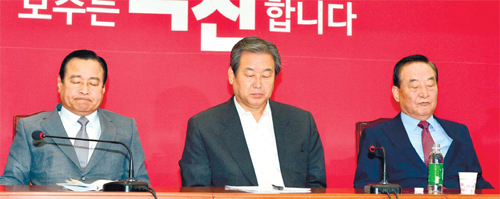| 새누리당 김무성 대표(가운데)가 4일 국회에서 열린 최고위원회의에서 송광호 의원 체포동의안 부결에 대해 사과한 뒤 이완구 원내대표(왼쪽), 서청원 최고위원과 함께 굳은 표정으로 앉아 있다. 이재문 기자 |