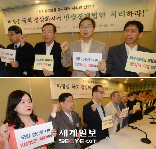 [포토] 국회 정상화 축구 지식인 선언 기자회견 입력 : 2014-09-04 19:47:14 수정 : 2014-09-04 19:47:14 구글 네이버 유튜브 4일 오전 서울 중구 프레스센터에서 열린 ‘국회정상화를 촉구하는 지식인 선언 기자회견’에서 전·현직 교수 등이 세월호 사고 발생 이후 국정이 마비된 국회를 정상화시키고 민생-경제법안의 조속한 처리를 촉구하며 구호를 외치고 있다. 김범준 기자 bjkim@segye.com Copyright ⓒ 세계일보. 무단 전재 및 재배포 금지 세계일보 김범준