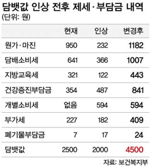 보건복지부는 12일 국민건강증진법 개정안 입법예고를 통해 궐련 20개비당 건강증진부담금을 354원에서 841원으로 올림과 동시에 전자담배를 비롯한 다른 종류의 담배들도 같은 비율로 부담금을 인상한다고 밝혔다.