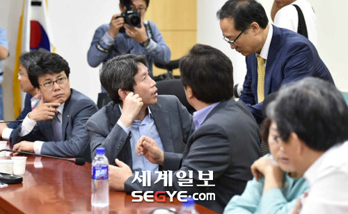 | “朴 퇴진해야” 새정치민주연합 박영선 국민공감혁신위원장 겸 원내대표의 퇴진을 공개 요구했던 진성준, 이인영 의원(왼쪽 두번째부터) 등 18명이 15일 오전 국회 의원회관 간담회실에 모여 박 위원장의 탈당 시사 발언과 관련해 대책을 논의하고 있다. 남제현 기자 |