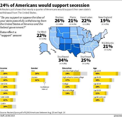 지역별로는 텍사스주 등이 포함된 미 서남권의 독립 여론이 가장 높았다. 독립 찬성 의견이 34%로, 수도 워싱턴과 뉴욕주 등 뉴잉글랜드지역(19%)의 2배에 육박했다. 서부 내륙 지역인 로키산맥은 26%, 플로리다주 등 동남권은 25%로 비교적 높았고, 캘리포니아주 등 서부권과 미시간주 등 북부 지역은 22% 정도로 낮은 편이었다.