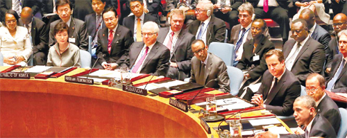 | 박근혜 대통령이 24일 오후(현지시간) 미국 뉴욕 유엔본부에서 열린 유엔 안전보장이사회 정상회의에 한국 대통령으로서는 처음으로 참석해 의장인 버락 오바마 미국 대통령(맨 아래)의 발언을 경청하고 있다. 뉴욕=연합뉴스 |