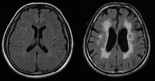| 정상인의 MRI 사진(왼쪽)과 야간혈압 상승으로 인해 뇌백질이 변화한 환자의 사진(오른쪽)이다. /고려대안산병원 제공 |