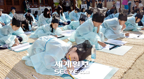 시짓기 여념없는 꼬마선비 입력 : 2014-10-03 19:09:12 수정 : 2014-10-03 19:09:12 구글 네이버 유튜브 하늘색 도포를 두르고 유건을 쓴 학생들이 3일 서울 개봉동 글마루한옥도서관에서 열린 ‘구로 책 축제’ 프로그램 중 하나인 ‘구로시(詩)’ 행사에 참여해 시를 짓고 있다. 구로 책 축제는 주민들의 독서의욕을 높이고 책 읽는 분위기를 확산하기 위해 기획됐으며, 지난 1일부터 오는 5일까지 계속된다. 이재문 기자 Copyright ⓒ 세계일보. 무단 전재 및 재배포 금지 세계일보