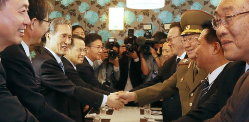 | 2014 인천 아시안게임 폐막식 참석차 방남한 북한 김양건 대남비서 겸 통일전선부장(오른편 좌석 왼쪽 두번째부터), 황병서 군 총정치국장, 최룡해 당중앙위원회 비서 겸 국가체육지도위원장이 4일 오후 인천 남동구의 한정식집에서 김관진 청와대 국가안보실장과 류길재 통일부 장관 등 우리측 대표단과 식사 전 악수를 나누고 있다. 사진공동취재단 |