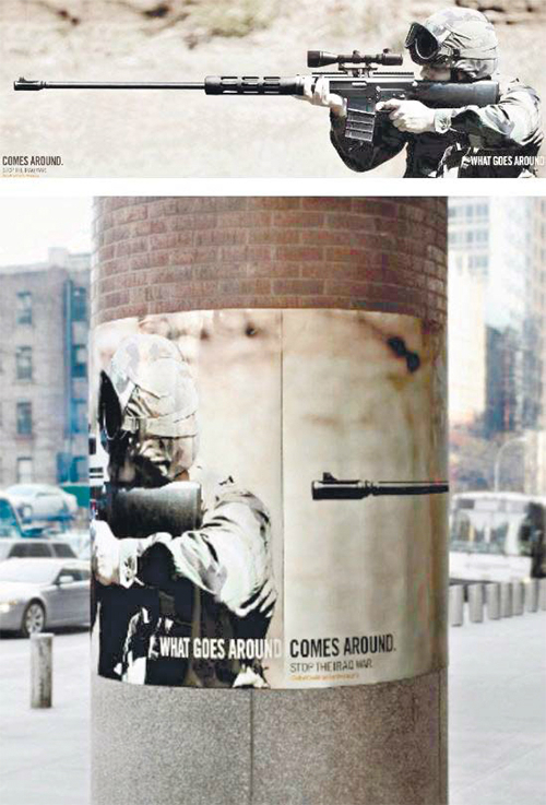 〈다〉의 광고는 총을 겨눈 사진을 먼저 보여주고 첫 번째 이미지를 구부려서 총을 겨눈 군인의 총이 자신에게 향하게 되어 있음을 보여준다. 이는 누군가를 향한 총부리가 결국 자신을 향해 온다는 ‘역설’을 의미한다.