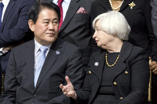 | 옐런 만난 최경환 최경환 경제부총리 겸 기획재정부 장관(왼쪽)이 11일(현지시간) 미국 워싱턴에서에서 열린 IMF(국제통화기금)·WB(세계은행) 연차총회에 참석해 재닛 옐런 미 연방준비제도(Fed) 의장과 각국의 경기부양 정책 등에 대해 이야기하고 있다. 기획재정부 제공 |