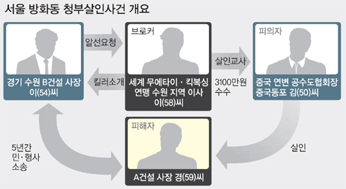 이 사장은 지난해 9월 30년 넘게 알고 지내던 브로커 이씨에게 “보내버릴 사람이 있으니 작업해 줄 사람을 알아봐 달라”고 제안했다. 수원지역 ‘세계 무에타이·킥복싱 연맹’ 이사를 지내던 이씨는 중국에서 열린 체육 행사 때 알게 된 김씨에게 홍씨 제거를 부탁했다. 2011년 한국에 입국해 직장을 구하지 못해 생활고에 시달리던 김씨는 제안을 받아들였다. 김씨는 홍씨가 퇴직한 사실을 알고 ‘표적’을 경 사장으로 바꾸었다.