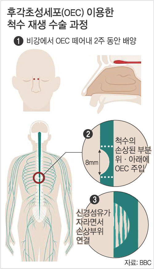 연구팀은 먼저 피디카의 비강에서 OEC를 떼 2주 동안 배양했다. 그 뒤 배양한 OEC를 척수의 손상된 곳 윗부분과 아랫부분에 주입했다. 그러자 신경섬유가 자라면서 척수에 있던 약 8㎜ 길이의 손상 부위를 메웠다.