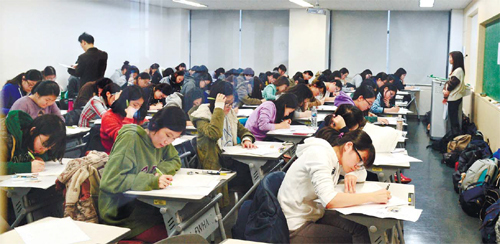 | 2014학년도 이화여대 수리논술은 어려워 많은 학생이 접근하지 못했다. 그러나 정적분의 기본 개념과 의미를 알고 조금만 생각하면 충분히 풀 수 있다. 사진은 지난해 이화여대에서 수험생들이 수시모집 논술고사를 치르는 모습. 세계일보 자료사진 |