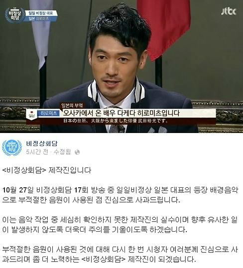 이에 기미가요 논란에 대해 '비정상회담' 제작진 측은 "10월27일 비정상회담 17회 방송 중 일일비정상 일본 대표의 등장 배경음악으로 부적절한 음원이 사용된 점 진심으로 사과드린다"며 "이는 음악 작업 중 세심히 확인하지 못한 제작진의 실수이며 향후 유사한 일이 발생하지 않도록 더욱더 주위를 기울이도록 하겠다"고 밝혔다.