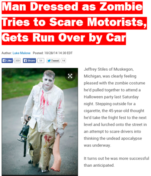 보도에 따르면 제흐 스틸스(45)라는 이름의 남성은 오타와 카운티의 한 도로에서 지나가던 차에 치이는 사고를 당했다. 큰 부상은 아니었지만, 병원에 실려온 스틸스를 보는 순간 의료진은 놀랄 수밖에 없었다. 스틸스의 옷차림은 영락없는 좀비와 비슷했기 때문이다.